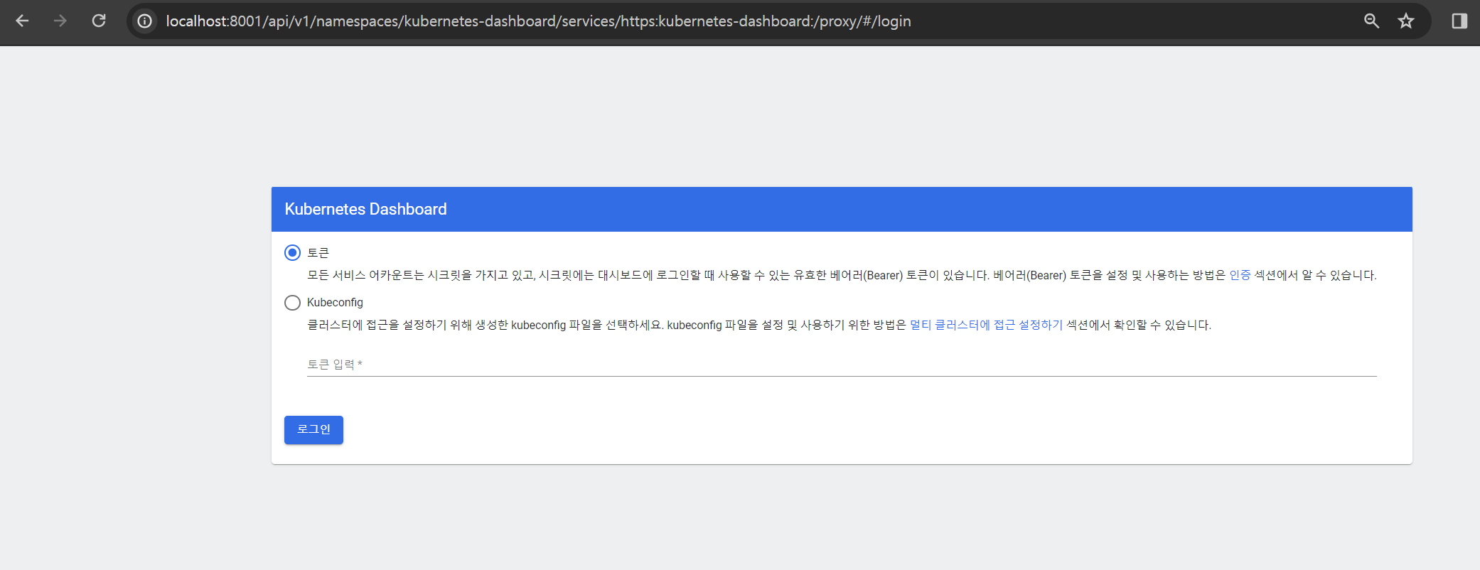 프록시가 실행되고 나면, 웹 브라우저를 통해 ( http://localhost:8001/api/v1/namespaces/kubernetes-dashboard/services/https:kubernetes-dashboard:/proxy/ ) 주소로 접속합니다.
