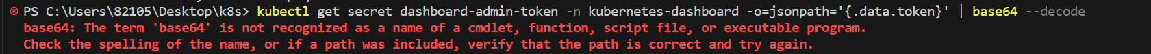 $secret = kubectl get secret dashboard-admin-token -n kubernetes-dashboard -o=jsonpath='{.data.token}'
