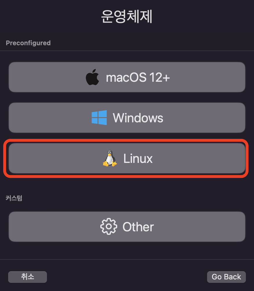 - 설치한 UTM을 열고 [새 가상머신 만들기] 클릭 -> [Virtualize] 클릭 -> [Linux] 클릭