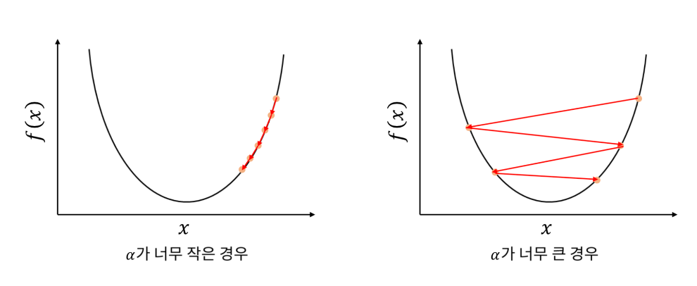 - 학습률 (learning rate) 가 큰 경우 - 한 번 이동하는 거리가 크므로 시간이 적게 소요되지만 극소점으로 가는 방향과 반대로 이탈하는 문제가 발생할 수 있음.
