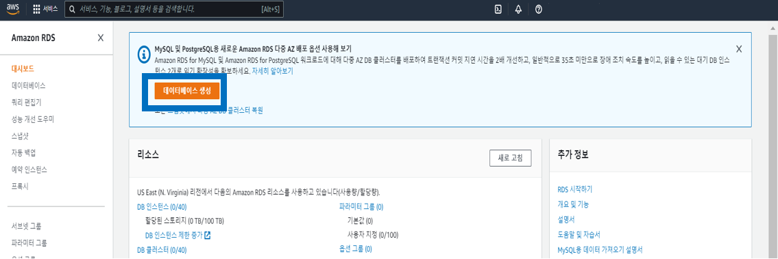 RDS에 들어간 후, [데이터베이스 생성] 버튼 클릭