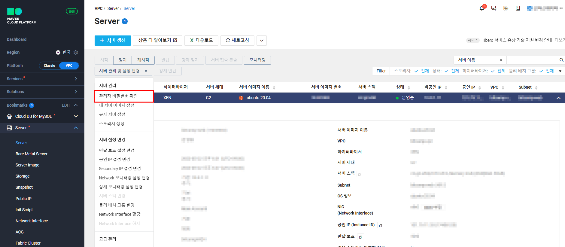 [ 서버 관리 및 설정 변경 ] -> [ 관리자 비밀번호 확인 ] 클릭