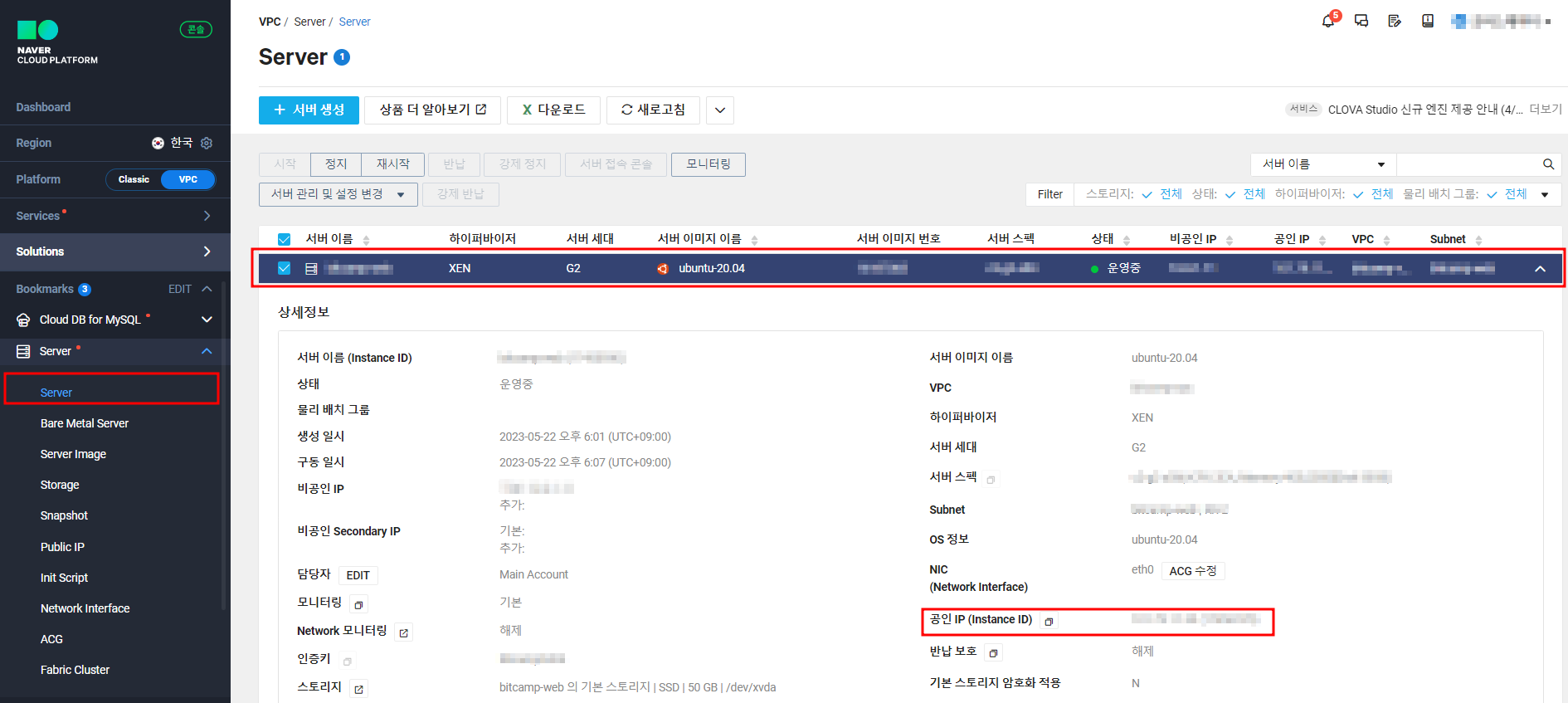 [Server] 클릭 -> 해당 서버 클릭 -> 공인IP (instance ID ) 확인