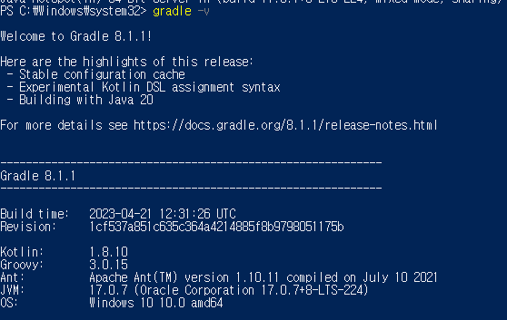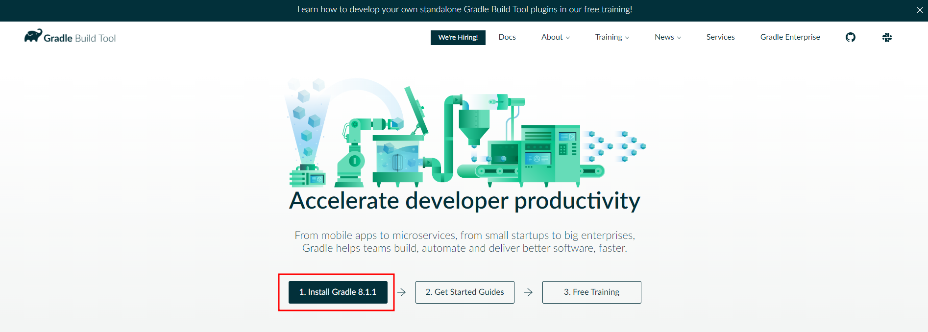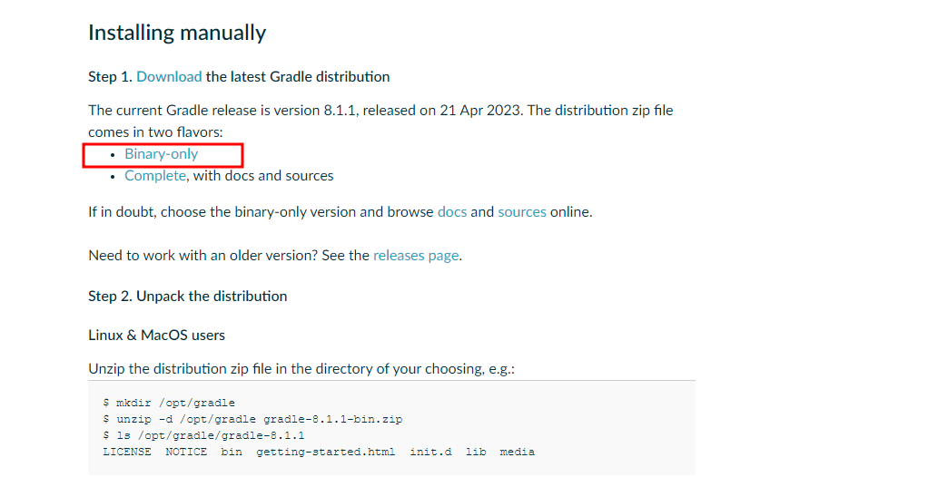 [ 1. Install Gradle 8.1.1 ] 버튼 클릭 -> [ Installing with a package manager ] 클릭 -> [ Binary-only ] 클릭