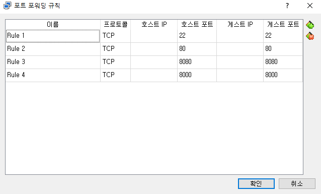 [네트워크] 버튼 클릭 -> [ Advanced ] -> [ 포트 포워딩 (d) ] 클릭 후 아래 사진과 같이 규칙 설정하기.
