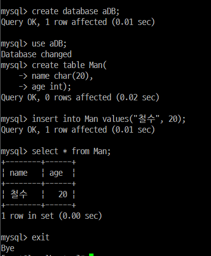 mysql> insert into Man values("철수", 20);