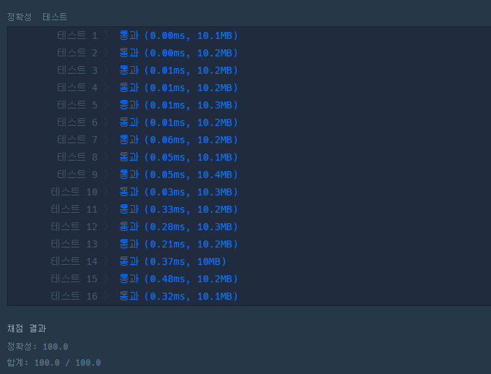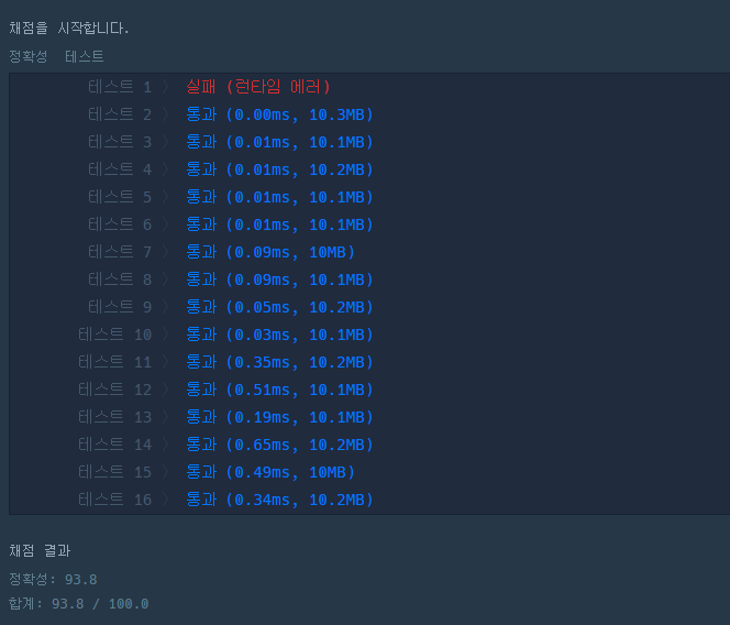 위의 풀이로 문제를 풀었더니 테스트1에 런타임 에러가 발생했다..ㅠ