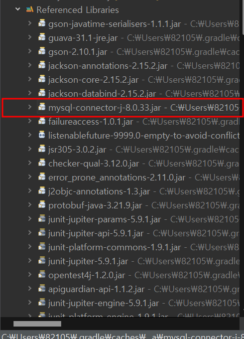 [Referenced Libraries] 에 'mysql-connector-j-8.0.33.jar' 파일이 표시된다면 이클립스 프로젝트가 MySQL Connector/J 라이브러리를 사용할 수 있음을 의미합니다.