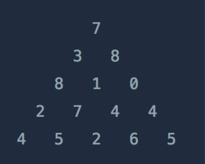- 두 번째 요소 7은 아래층의 두 번째 5와 세 번째 2 중에서 큰 값인 5와 합쳐져 12가 된다.