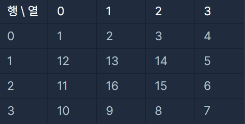 따라서 [[1, 2, 3, 4], [12, 13, 14, 5], [11, 16, 15, 6], [10, 9, 8, 7]]를 return 합니다.
