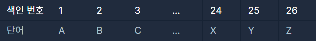 이 과정을 거쳐 다섯 글자의 문장 KAKAO가 4개의 색인 번호 [11, 1, 27, 15]로 압축된다.